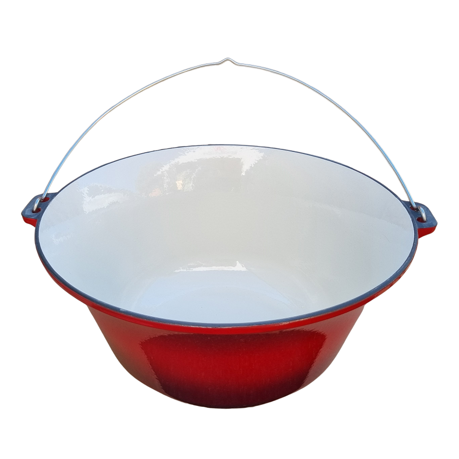 Nagy piros zománcozott öntöttvas bogrács 22 literes, 49 cm átmérő, 23 cm magas.
